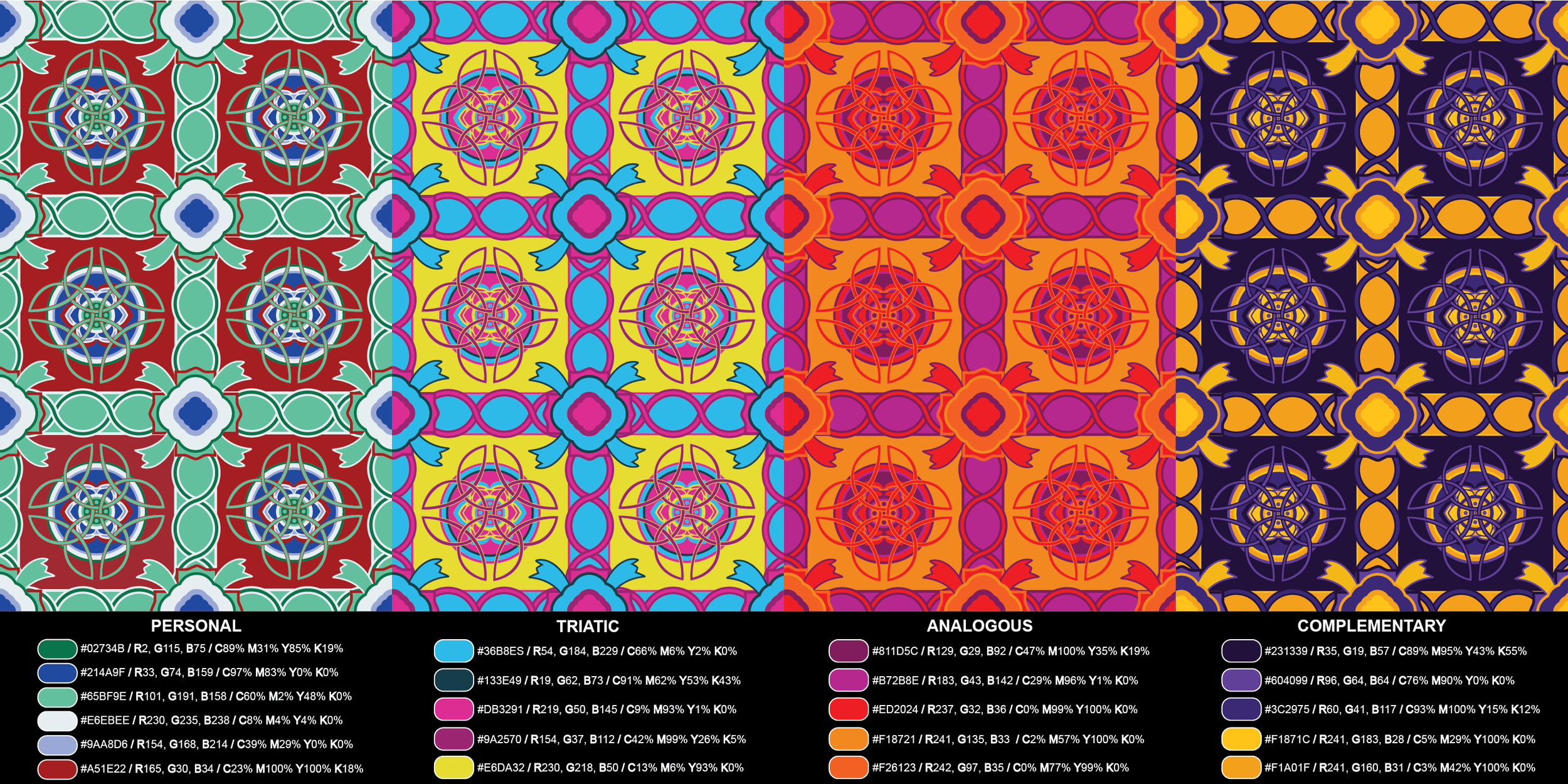 Personal Cultural Pattern The assignment was to make a pattern based on your heritage. Mine is Irish and Korean. With the pattern the goal was to explore color theory. back back